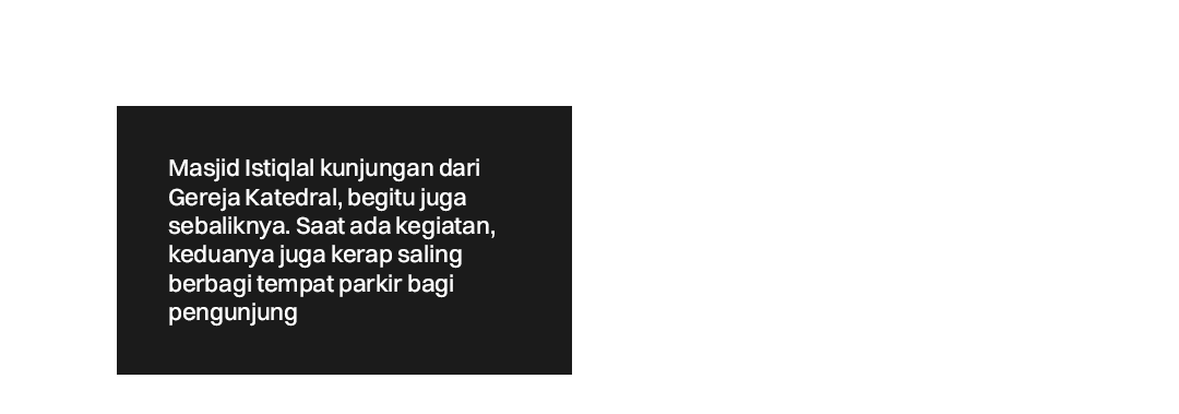 Misalnya saja pada tahun 2023 lalu, Masjid Istiqlal menyediakan kantong parkir untuk jemaat Misa Natal Gereja Katedral. Tempat parkir ini cukup besar dengan rincian mampu menampung 800-1.000 kendaraan milik jemaat Gereja Katedral.
