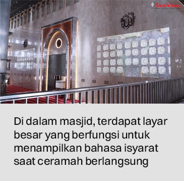 Jika kawan GNFI datang ke Masjid Istiqlal, tidak banyak hiasan atau ornamen yang terlihat sehingga suasana yang dihasilkan cenderung lebih clean. Di bagian mihrab atau tempat imam terdapat kiswah, yakni bekas kain penutup ka’bah yang merupakan hadiah dari Raja Arab Saudi.