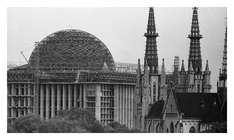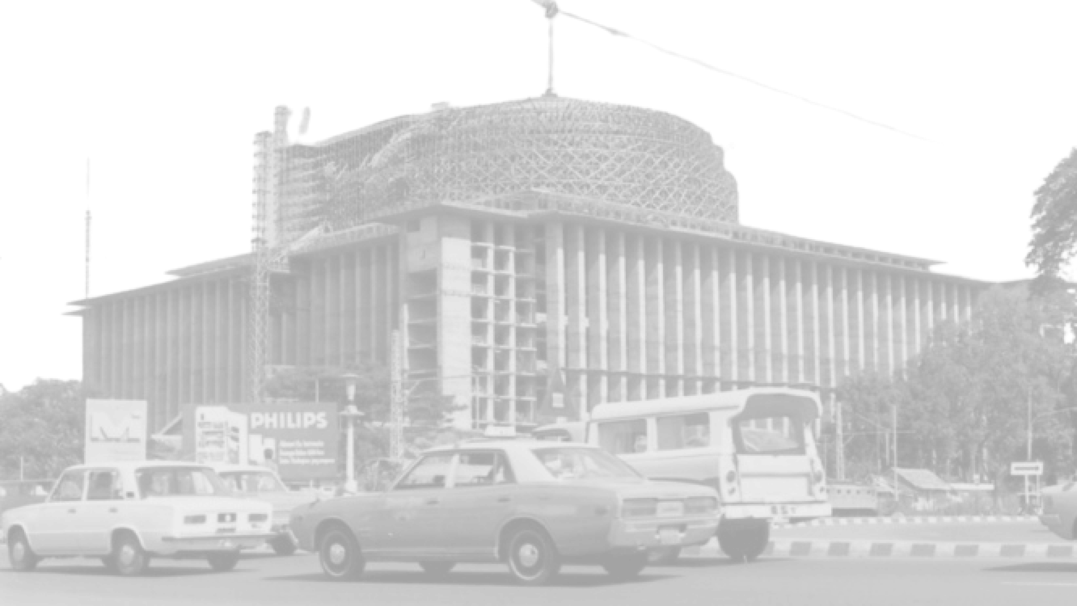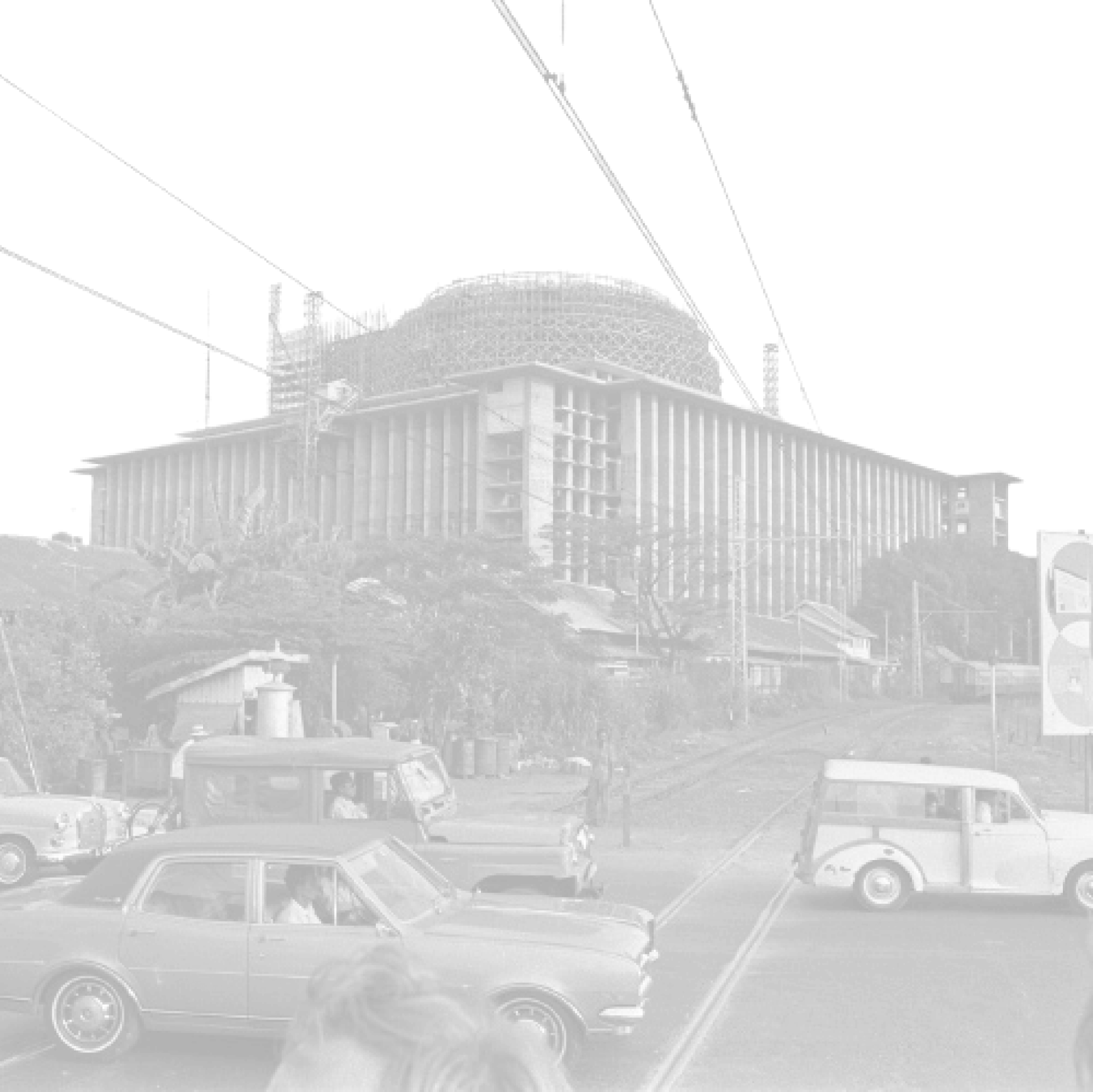KOMPAS/H Kodhyat Persiapan pengecoran kubah Masjid Istiqlal pada awal Agustus 1971. Lokasi masjid negara yang tengah dibangun itu bersebelahan dengan Gereja Katheral Jakarta.