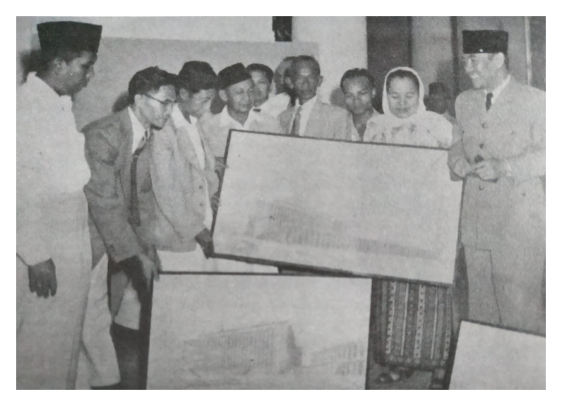 Presiden Sukarno dan dewan juri sayembara perancangan Masjid Istiqlal berfoto dengan tiga panel gambar karya F. Silaban yang ditetapkan sebagai pemenang pada 1955. Sumber: Selayang pandang Masjid Istiqlal (1987).